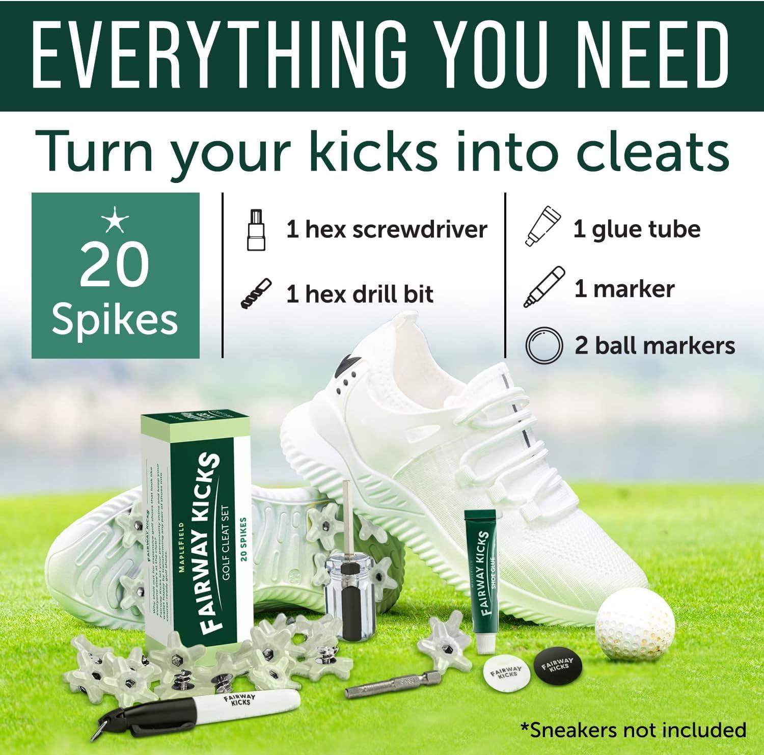 Complete Kit for Conversion –– All you have to do is supply the shoes. This set includes everything else required to add these traction spikes. Generously apply the included glue to the cleat threads and screw them into the sole to install these spikes for golf shoes. Colors to Compliment Any Kicks –– Spike up a pair of your old basketball shoes, or even your favorite sandals. Whatever pair you pick, we have a golf cleat color to match. Choose from black, white, clear, yellow, green, and a red/white/blue mix. Take Matters into Your Own Hands –– Get ready for the range or your next round in no time. This golf kit is a fun DIY solution that can be finished in just one day. Turn any shoe into golf shoes assuming they have rubber soles that are more than a 1/2 inch thick. Add Permanent Power to Your Game –– Stop swinging out of your shoes on every shot. Now you can have style and stability with these cleat spikes. Every set of golf shoe cleats is a durable and lasting addition to your footwear, to help prevent over-rotation and potential injury. Look Fashionable on the Fairways –– Tired of boring golf shoes that look like your grandfather’s? With these spikes for shoes, you can convert your favorite kicks into a course-ready pair. Wear what you want and still get the same traction with custom spike shoes.Color: Clear. Material: Rubber. Brand: Maplefield. Style: Big Cat Clear. Sport Type: Golf. Date First Available: February 6, 2023. Best Sellers Rank: #15,505 in Sports & Outdoors. Customer Reviews: 3.8 out of 5 stars26 ratings3.8 out of 5 stars. : B0B4BDZL3V. Sport Type: ?Golf. Style: ?Big Cat Clear. Manufacturer: ?Maplefield. Material: ?Rubber. Color: ?Clear. Brand Name: ?Maplefield. Item DimensionsLxWxH: ?4.9 x 1.7 x 1.7 inches. Package Weight: ?0.15 Kilograms. Item Package Dimensions L x W x H: ?5.12 x 1.69 x 1.65 inches.