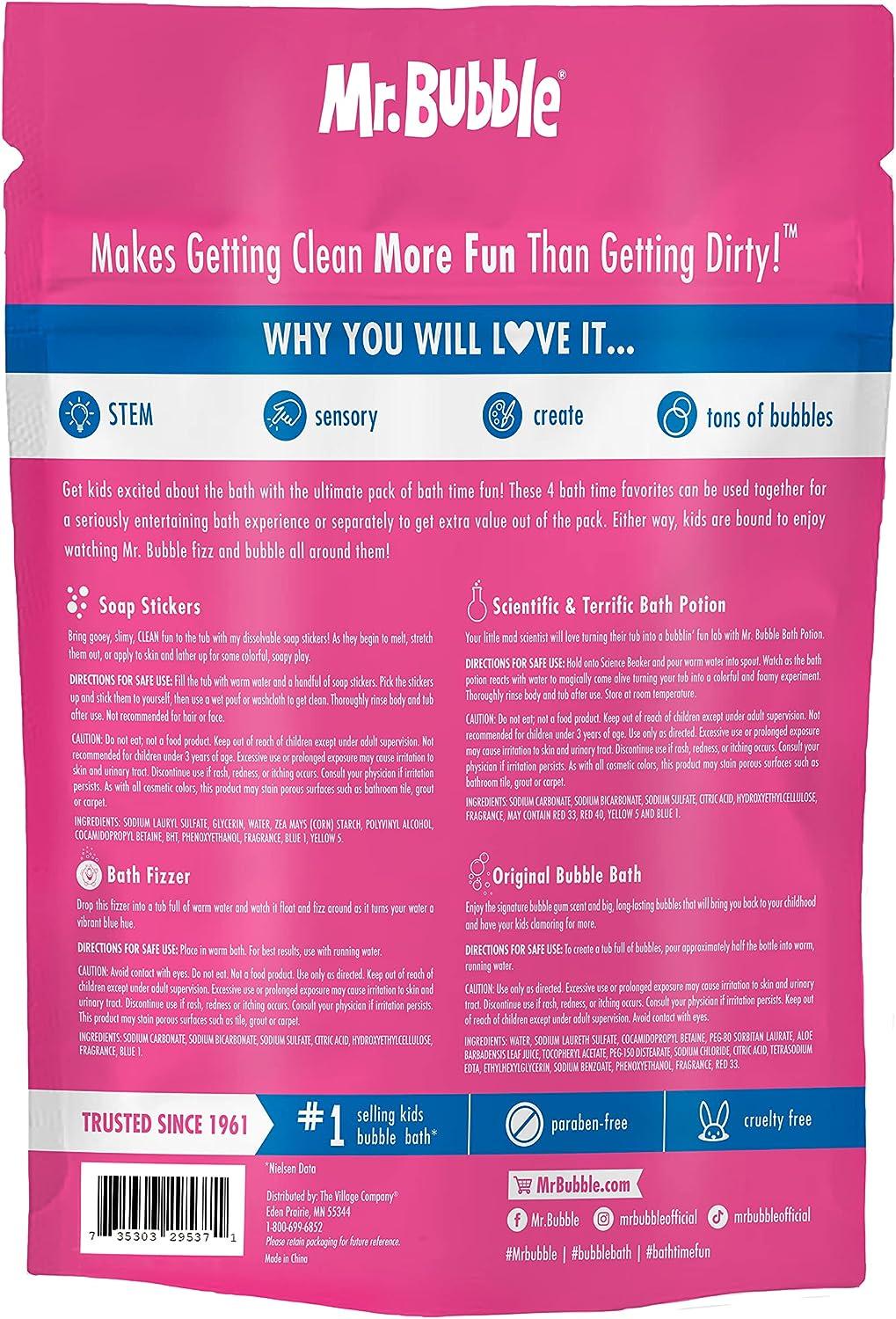 YOUR BATH-TIME BUDDY: For over 60 years, Mr. Bubble has been one of the most popular bubble baths in America. Our products are made in the USA, creating the best bath time experience for adults, kids and babies. EASY AND FUN: Getting clean in the tub has never been so fun! Grab one of Mr. Bubble’s favorite bath products from the Ultimate Pack of Bath Time Fun and create your own unique adventure in the tub. Make long lasting memories together as a family with America’s Favorite Bath Time Buddy, Mr. Bubble. SAFE AND ENTERTAINING: Get kids excited about the bath with the Ultimate Pack of Bath Time Fun! This must-have pack features all of the essentials, including Mr. Bubble’s Scientific & Terrific Bath Potion, Bath Bomb Fizzer, Gooey Soap Stickers, and a 2.5 Oz bottle of Original Bubble Gum scented Bubble Bath to get kids sudsy clean after play time. BATHTIME EDUCATION: Promote sensory play and STEM learning by turning the tub water into a colorful, foamy and fizzy science experiment! Use these 4 bath time favorites separately for a creative bath experience, or all together for an explosion of bubblin’ fun in the tub.Best Sellers Rank: See Top 100 in Beauty & Personal Care. Variety: Bath Bomb. Item Weight: 50 Grams. Item Form: Powder. Number of Items: 2. Unit Count: 9.0 Ounce. Product Benefits: Long Lasting,Clean. Brand: Mr. Bubble. : B09V3FSMB1. Manufacturer: The Village Company. Date First Available: March 8, 2022. Item model number: 29537. Package Dimensions: 10.04 x 8.31 x 3.23 inches; 1.76 Ounces.