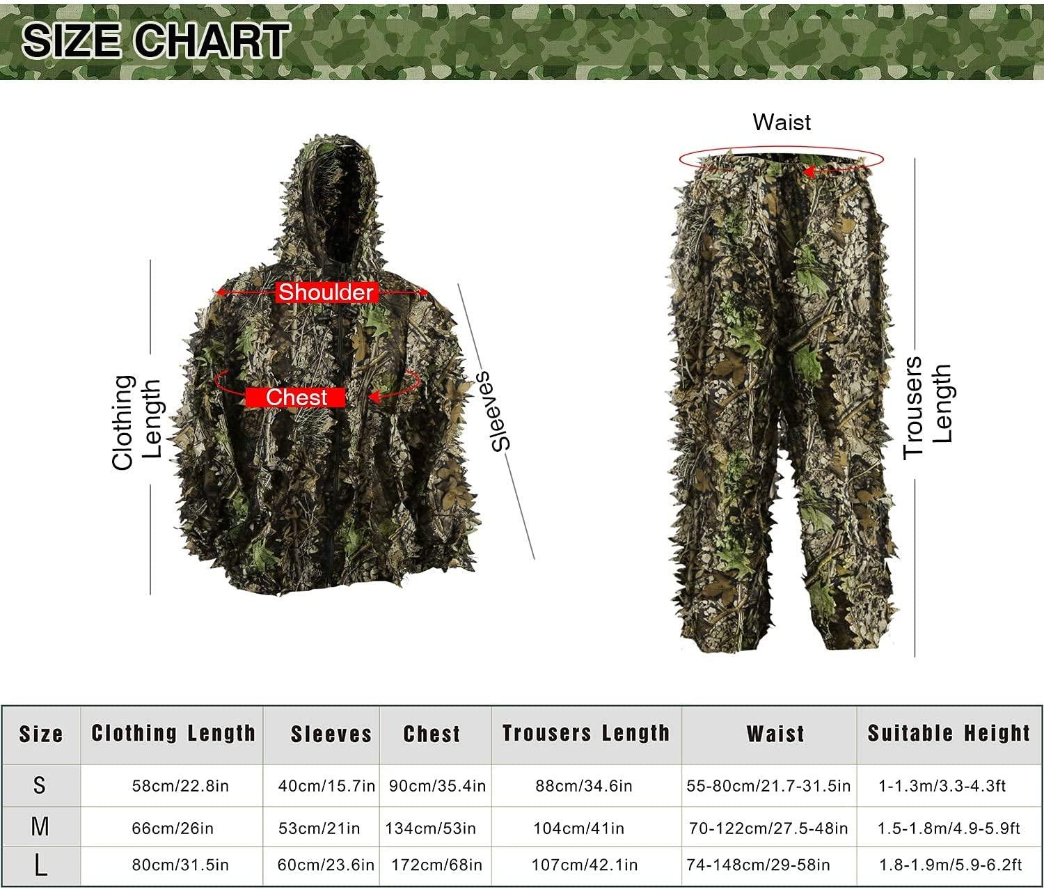 Package for leafy ghillie suits included: 1x hoodie camo leafy Jacket and 1x camouflage pant. Unisex Camouflage Ghillie Suits suit for all men, women,kids, teens fit for 3.3-4.3ft tall. Ideas for forest play, bush trail pranks clothes,costume for pranks,halloween costume,jungle hunting,photography etc. Front open jacket with zipper design, waist adjustable and pant leg is elastic, vivid 3D forest leafy clothes and sturdy fabric. Material for this woodland leafy camo hoodie ghillie suits is polyester bionic fabric, help you perform better in games. Imported. polyester bionic fabric.Date First Available: November 3, 2017. Best Sellers Rank: #12,644 in Sports & Outdoors. Customer Reviews: 4.4 out of 5 stars744 ratings4.4 out of 5 stars. : B0775WJYD4. Size: ?Height 3.3-4.3 ft. Part Number: ?BO-WZYF17. Manufacturer: ?PELLOR. Suggested Users: ?Boys. Material: ?Polyester. Color: ?Green. Brand Name: ?PELLOR. Item DimensionsLxWxH: ?5 x 5 x 0.7 inches. Package Weight: ?0.25 Kilograms. Item Package Dimensions L x W x H: ?10.2 x 8.66 x 2.44 inches.